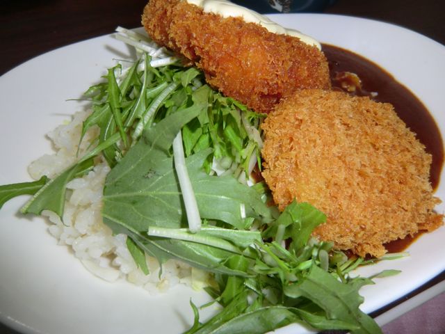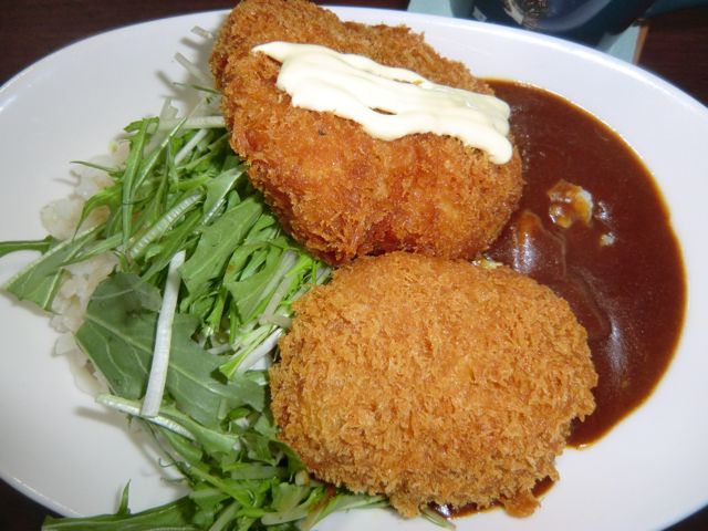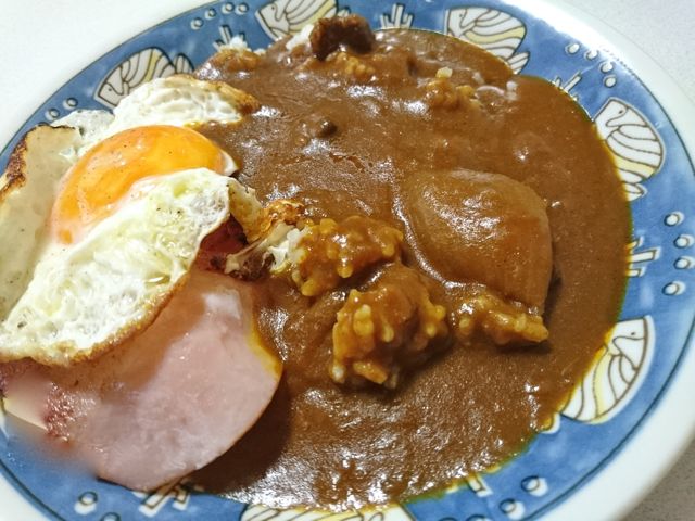 手作りコロッケと目玉焼きを乗せた自家製カレー。