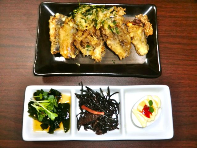 出し巻き玉子、タコボール、たこ焼き、わかめの酢の物。