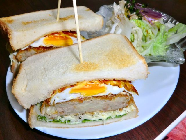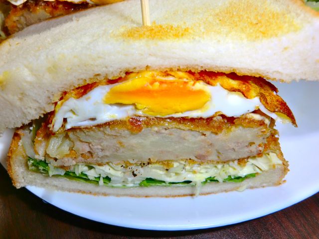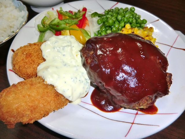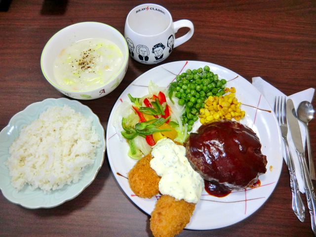 コロッケと魚肉ソーセージのフライを付け合わせにした、カロリー満点のファーストフード。