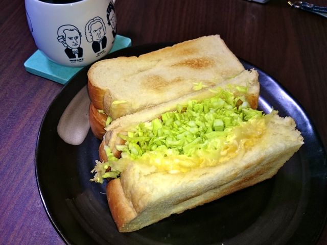 片側のパンにスクランブルエッグととろけるチーズを乗せてトーストし、キャベツをサンドしたサンドイッチ。
