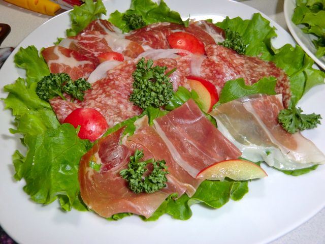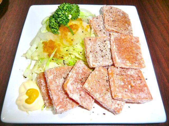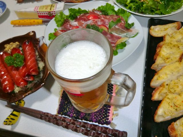 今夜のお通しは、焼きピーマン、インゲンの焼き肉のタレ炒め、ソーセージの辛子マヨネーズ和え、カツ煮。
