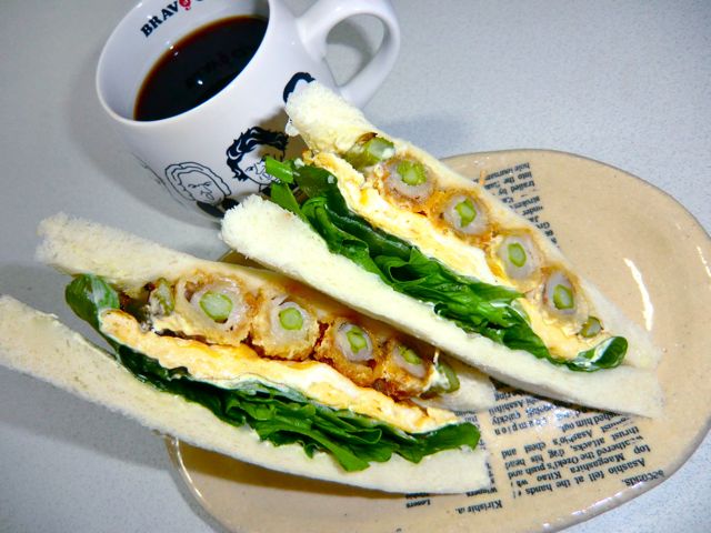ラップできっちりとめながら挟むとたくさんのものが挟めるけども、食べるのは大変だ(笑)