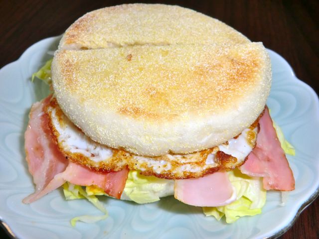 ベーコンと目玉焼き、野菜をこんがり焼いたマフィンでサンド。